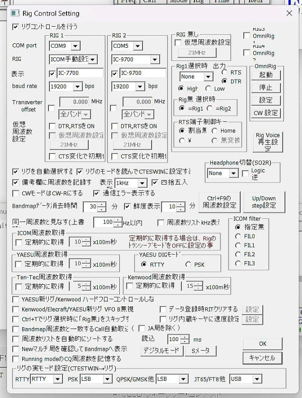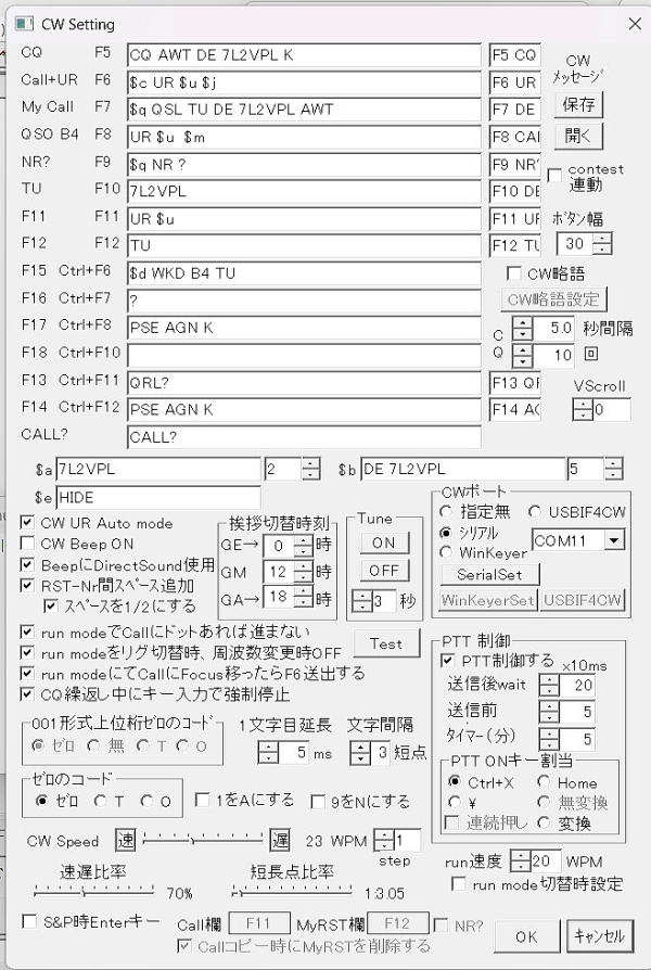 EXCHANGEを送るとき相手の名前を送信する$c $g $y san $u BK ur RSTの文字列から599を除いた部分を送る$g UR $m RIG切替えIC7300とIC9700を切替えて使う 1.メニューの設定→RIG選択 RIG1:IC-7300 COM9 / RIG2:IC-9700 COM5 2.メニューのCWパラメータ→CWポートの選択 IC-7300:COM3 IC-9700:COM7 【注意】 ここで注意すべきは設定→リグコントロールとCWパラメーターのCOMポート設定の意味である リグコントロールはTRXの周波数やMODEの読み出し/書込みで、他方CWパラメータのCOMポート設定はCWキーイングのPORT設定である 2026.03.28(Sat) ICOM 3台目(IC-7700)のリグコントロール、CWポートの追加をしたいのだが リグコントロールは最大2台まで なので、一覧に無いIC-7700を使うにはリグコントロール設定でRIG1のCOM9 IC-7300の設定をICOMの手動選択を選んでCI-Vアドレスに74を設定 CWポートはIC-7700のRS-232Cポートを使用しないといけない IC-7700のRS-232CポートにUSB-Serialを介して接続してみるとCOM4が現れた ![]() IC-7700のRS-232CポートにUSB-Serialを接続する前 ![]() ↑IC-7700のRS-232CポートにUSB-Serialを介して接続した後 COM4出現 ところが、IC-7700のRS-232Cポート経由でCWのKeyingが現時点で出来ていない 2026.03.28 Serial Numberを送る「Ur RST」と書いてある入力欄をクリックして現れるダイアログに、バンド毎に送るコンテストナンバーを入力してください。 001からカウントアップするコンテストの場合はUr RST欄に599001のように入力してください。1局登録毎に自動的にカウントアップしていきます。 出典:CTESTWIN MANUAL $qを使ってスムースな相手コール問い合わせ(?)と訂正確認F4キーまたはCQボタンにより、以前にコールサインを送信したときにdotが含まれていた時、または、コールサインが変更された時に、入力覧に表示されている文字を送信します。 以前に送ったときにdotがなければ何も送信しません。 コールの中にスペースまたはピリオドがあったら'?'に変換して送信します。なお、'?'が複数続く場合は1つにします。 $q NR?と入れておくと、ランニングモードで、コールサインを変更した時にコールを再送します。 出典:CTESTWIN MANUAL $j 連続符号 PROSIGNSAR,BTなどの連続符号を作成します。 $jの次の2文字が連続して送信されます。例えば、ARを連続符号にする場合は$jARとなります。 1メッセージに対して連続符号は1文字しか入れることができません。但し、WinKeyerの場合は何文字でも入れられます。 出典:CTESTWIN MANUAL ![]() |