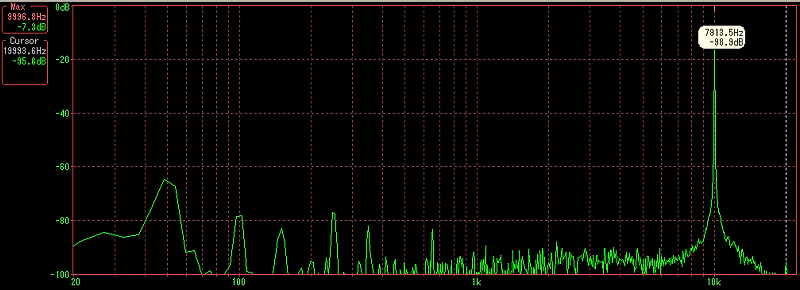 基本波10KHz -7.3dBで2次高調波レベルは −96dB 3次高調波レベルは帯域外のために計測不能