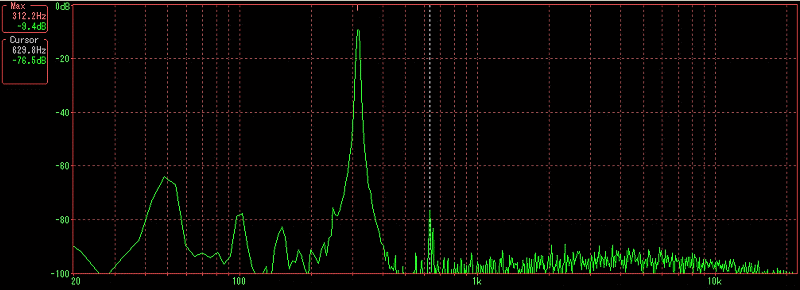 基本波315Hz-9.5dBで2次高調波レベルは-76dB 3次高調波レベルは測定不能 |