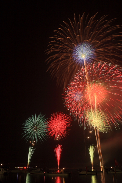 静岡県・浜松市で7月に行われる花火大会。浜名湖上で打ち上げられる花火は、本格的な夏の花火大会シーズン到来を告げる。