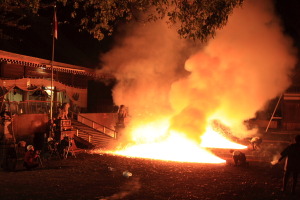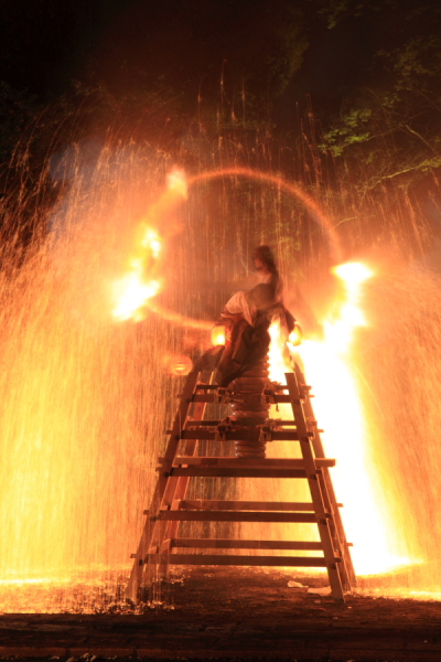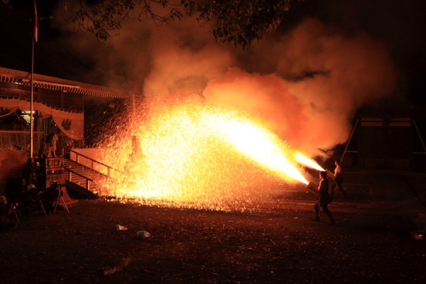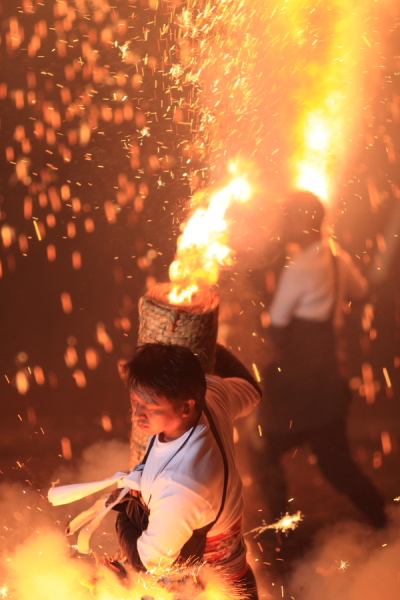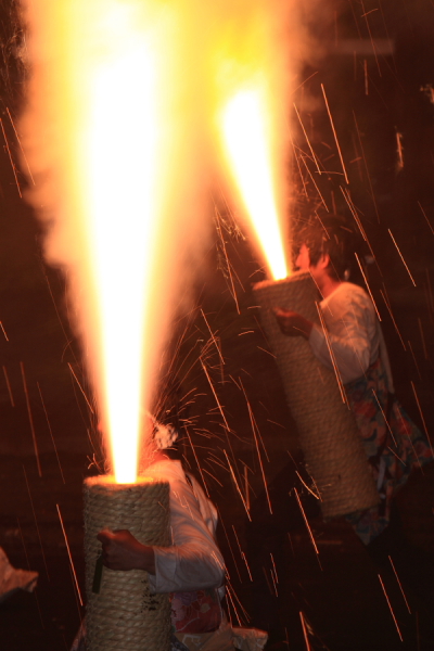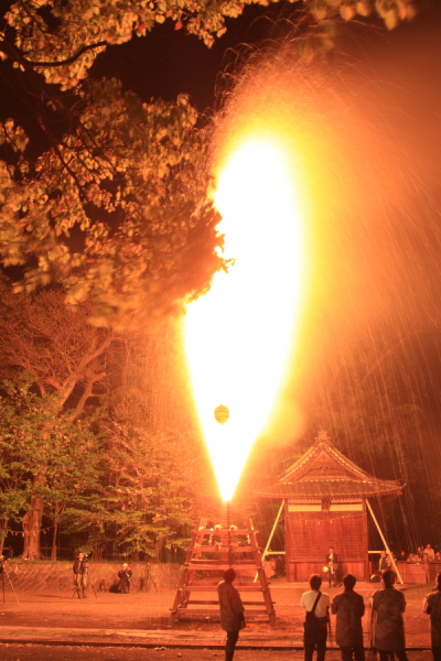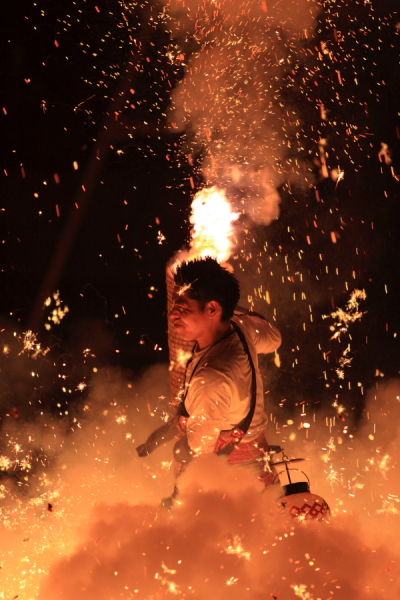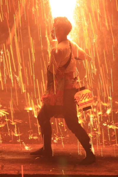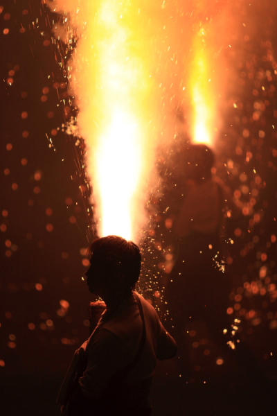 愛知県・小坂井町で毎年4月に行われる、風まつり。夜行われる花火は、打ち上げ花火や仕掛け花火、そして豪快な手筒花火と多彩です。