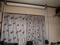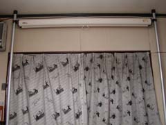 | スクリーンの設置 通常は天井に直取り付けするのですが、天井裏に金具を設置したり天井を補強したり色々大変です。そこで便利なのが天井と床の間に突っ張りポールのような2本のポールを立て、その間にスクリーンを渡す方法。これだと壁や天井は無傷で模様替えのときも移動が楽です。 |