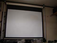 | ▼スクリーン 私が使っているのは80インチのスプリング巻き上げ式で素材はマット式。素材にはビーズやマットなど数種類あってモノによって値段がかなり違います。これは使い方やプロジェクタの性能などによって何が最適かそれぞれ異なるので、お店に相談した方が良いと思います。 電動式とスプリング式では同じ素材・サイズでも倍くらい価格差があります。スプリング式は手で引っ張って下ろすので、使っているうちにスクリーンにしわが寄るという話をどこかで聞いたことがありますが、毎日何回も出し入れするなら影響は無視できないかも知れませんが、私が使う(月数回程度)限りではほとんどないと思います。 |