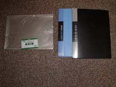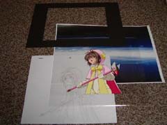 | 背景がある場合は背景の上にセル画を重ね、セロテープやホチキスで止め、そのまま袋詰めします。ショップで買った場合はその状態で売られていることが多いです。また背景とセル画が貼りつかないように、袋を切ってシート上にしたものを間に挟むと良いです。 また実際の映像に近い状態で見せるために、黒紙を画面サイズに切り抜いて不要な部分を隠すと見た目が良くなり効果的です。背景なしの場合は、適当な背景をカラーコピーして流用(同じ作品の別のカットがあれば○)する、または黒紙を背景代わりにしくと見た目がかなり良くなります。 |