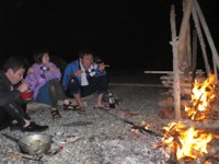 サイト設営して薪を集めたらさっそく釣りチーム、磯ものチーム、潮干狩りチームに別れて食料調達へ。潮干狩りチームは鶴島、明神島、鴎島を偵察するが砂浜がなく潮干狩れず。仕方ないので鴎島でカメノテをとって帰る。釣りチームの収獲もなぜかカメノテのみ。磯ものチームは薄いカサガイが少々。しかたないのでカメノテと貝を炙ったり茹でたりして食べながら、各チームとも明日以降も収獲が絶望的なことを報告しあう。