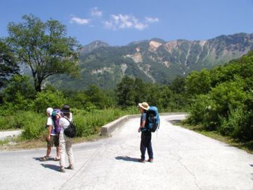 しかし監視所を通過できて油断してたのか、ちょっと会話に夢中になりすぎたようです。はっと気付いた時にはカーブの直ぐ向こうに車の気配が近づいてました。こう言う事態は不謹慎に脱北気分を高めます。最後尾の探検家はささっと道を横切り、丈の高い薮に飛び込みました。なかなか良い反応でしたが、ほかに飛び込みやすい茂みがなかったため他の仲間たちも同じ場所に続けて飛び込んで来て、薮の中でザックを背負った二人の下敷きになってしまいました。車が通り過ぎたあと「この蜘蛛の糸は僕のです。出てってください」と話ながら三人が茂みから這い出すと、残りのひとりバタやんは隠れもせず外で平然しています。「きみら丸見え。車の人ら笑てたで」とのこと。どうやら警戒しすぎのようです。そうなるともう車がきても隠れることなくもくもくと歩き続け、結局トンネルの入り口には昼過ぎに到着です。