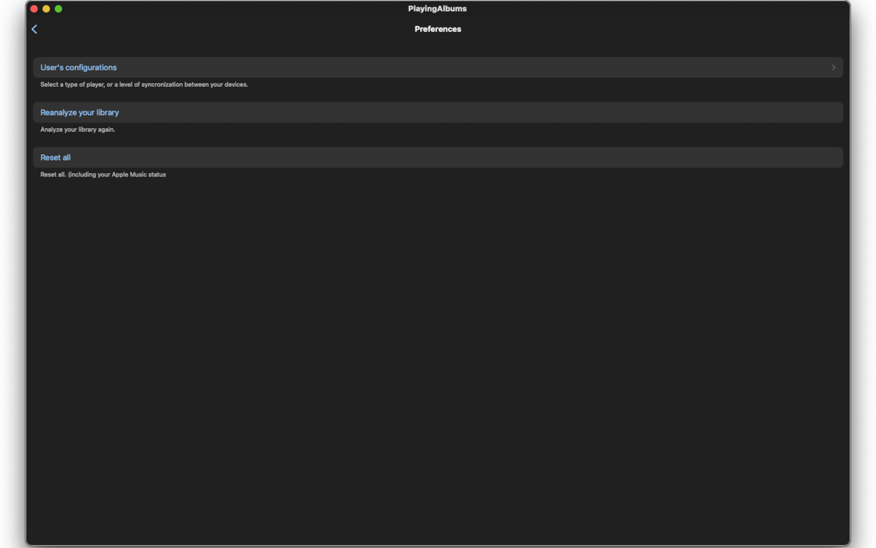 手動でライブラリの解析をしたい時や再生先を変更(システム標準かアプリケーション内か)したい時や同期レベルと変更したい時はプレイリストの一覧場面まで戻って右上のギアアイコンをクリックしてください。