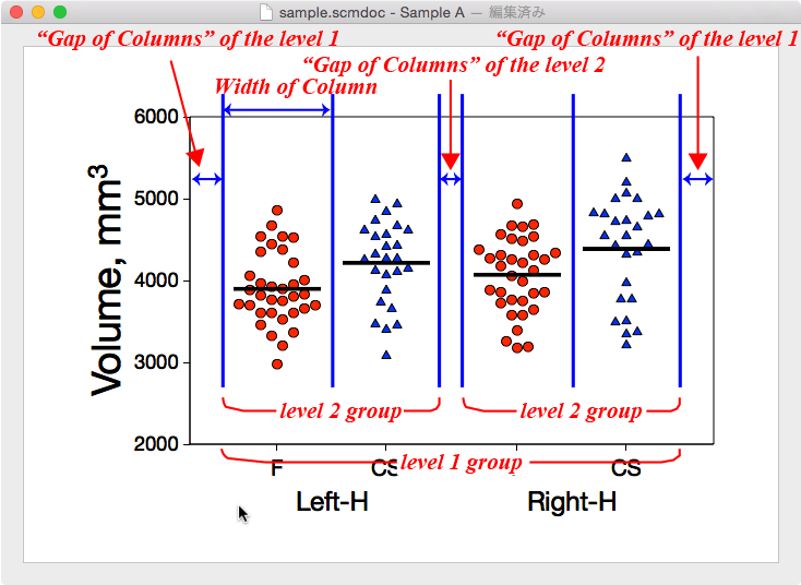 "Categorizing"で各分類ごとの設定を行います。前述のように分類のレベルの順番変更はここではできません。レベルごとに共通の設定を行います。X軸のタイトルの上下の間隔,水平方向の間隔を定義します。タイトルの表示は"Represent"で設定します。"Represent"で設定できる値に関してはグラフ上で直接書き換えることもできます。その場合,リターンを押すとそのまま改行コードが入力されるので注意が必要です("Config"ウィンドウ内ではリターンは値の確定を意味します)。水平方向の間隔(Gap of Columns)の意味は下の図に示す通りです。