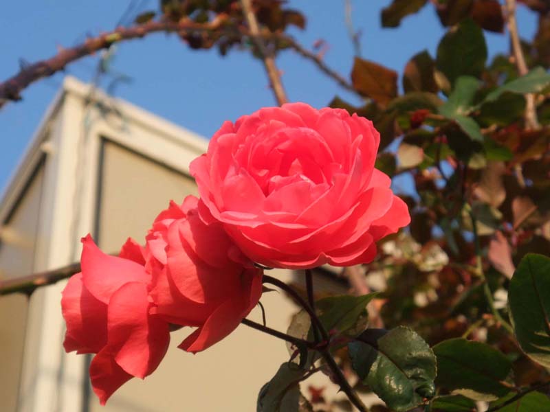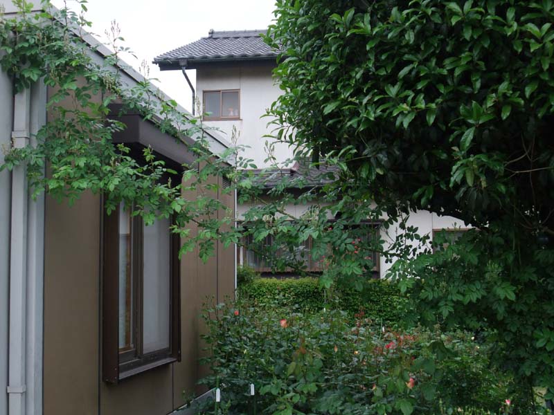 南西の角でイングリッシュがまだ咲いています。黄色がグラハムトーマス、ピンクがヘリテージです。花の写真もご覧下さい。