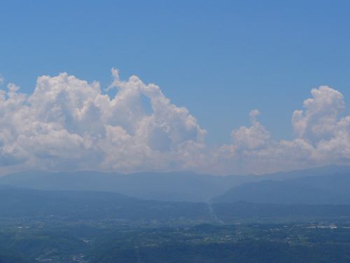 下界を一望。町の先には山。さらに上には白い雲と青い空。夏だ。夏のモクモクした雲は、眺めていると色々なものに見えてくる。