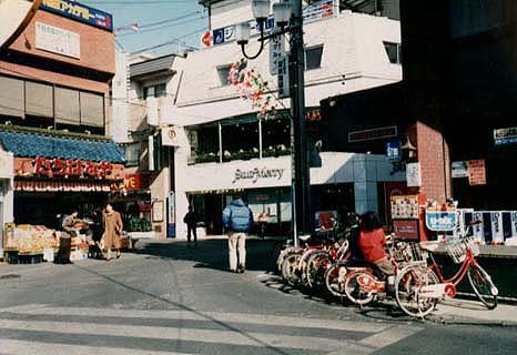 正面の白い建物は洋菓子の「Sun Merry」。これも作品中、「Sun Mary」、「Sunny