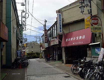 第20話「影を背負いて」冒頭の雨の商店街。その右手に描かれていた「時計・貴金属のお店 貴田」のモデルが、この画像右手の豊田時計宝飾店である。 あの雨の商店街は、ここより若干前からのアングルで描かれたものだが、周囲の店は変わっているかもしれない。1988年、1994年ともこのアングルの写真や映像が残っていないので、その辺の確認ができないのが残念だ。