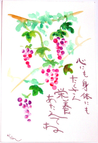 色鮮やかなぶどう、 秋の風情が素敵です。 この絵手紙は、私が体調を崩していた折に かりんさんが下さいました。 温かな絵と言葉に、とても励まされました。 貴重な絵手紙です。 かりんさん 本当にありがとうございましたm(__)m かりんさんのサイトはこちらから