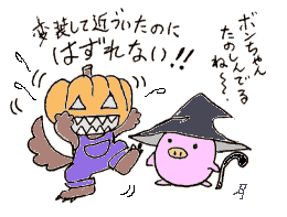 ぷくちゃん、ボンちゃんのハロウィン。 思わず、くすりと・・・ 楽しい2人、いえ、2匹ですね。 |