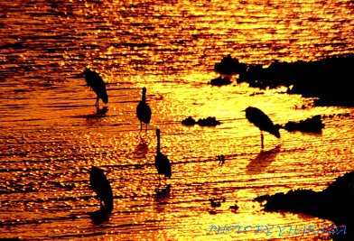 黄金に染まる水辺に集う