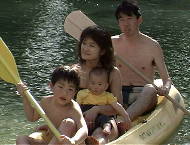 | 泳ぎ疲れてハンモックでお昼寝・・・ ・・・などするわけなく、寝転がって 遊んでいるだけ。 ようすけくんはカヌーの運転もお得意? |