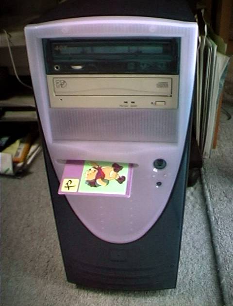 そうです、みんなともひろくんの仕業です。 フロッピーディスクを入れようとすると、何故か入らない。 そうしてよく見てみるとこんな状態です。 こんな虐待を受けながらも、我が家のパソコンは、けなげにも今日も元気に 動いています。 |