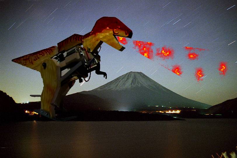 ![]() ようすけくんは、今恐竜に夢中です 特に「最強の肉食恐竜」と言われる「ティラノザウルス」が お気に入り。 図鑑を見て、自分で色塗りもできます。 おとうさんは調子に乗って富士山を背景に 暴れさせてしまいました。 まずはこの写真見てやって下さい。