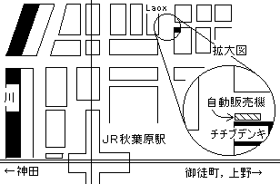 この自動販売機はチチブデンキ(ラオックス向かい)の横に設置してあります。アクセスはJR秋葉原駅より秋葉原デパートを通りラオックスを目指してください。