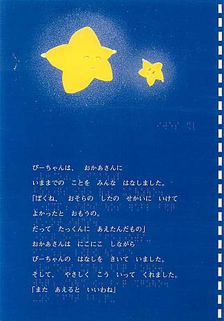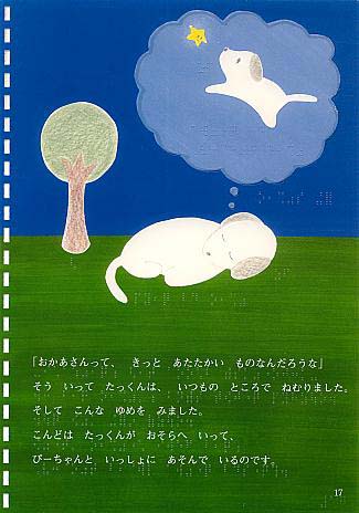 | あとがき これは、視覚障害者と健常者が一緒に読むことのできる絵本です。この絵本が、視覚障害者と健常者の親子にとっての大切な思い出のひとつとなってくれたら、と思いながらつくりました。 お子さんが小さいときには親子で一緒に何度も読んでほしいです。そしてときが経ってふとある日、この絵本にもう一度出会ったときに、一緒に絵本を読んだときのことを思い出していただけたら、こんなにうれしいことはありません。 視覚障害者のお母さんと健常者のお子さんを対象に制作しましたが、視覚障害者の子供たちや、その他でもいろいろな方にたのしんでいただければ幸いです。 これから先、このような絵本がもっとたくさん出版されることを願っています。 最後になりますが、協力してくださった先生方、並びに会社の方々、本当にありがとうございました。 |