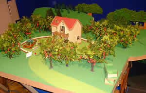 | 林 日出和:問題だったのはぶどうの木をどう表現するかと言う事でした。本当はぶどう棚に乗っているものなのでしょうが、自然の中で暮らしている彼らの生活とは合わないので、まるで普通の木にぶどうがなっているような表現にしてみました。、直径4ミリのプラスチック玉をいくつもボンドでぶどうの房のように張り込んで色を塗った物を大量に作りました。ダンスのシーンは人形の足にスチールシャフトを埋め込み下から強力な磁石で固定してアニメーションをしました。 ちなみにこの後の作品ではネコの男の子とウサギの女の子は大の仲良しと言う設定に(彩工房のスタッフの間では)なっています。(笑) |