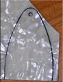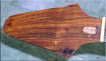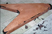 折れた所のパテが痛々しいですね。しっかり接着出来たら、おおまかに整形です。それから、補強の意味で(スペシャル?にするため)のツキ板は荒々しい杢目の出たココロボにしました。これまたザックリと整形します。え?不細工?接着してから耳付けて仕上げればいいんです(笑;;;;;; ついでにピックガードも作りました。予算がないのでベニヤ化粧板です。コントロール関係の穴は、配置を考えてからにします。