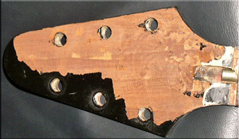 およそ24時間静置後、押さえの木片を取り(ヘッド表に少し木片が残ってしまいましたが)様子を見てみます。かなり汚い感じですが、欠損した部分以外はしっかりと接着されているようです。試しに、押したり引いたり多少強引に強度を確認。「うんうん、これなら弦の張力に充分耐えられるぞ」という強度になりました。塗装部分の欠けた所は、パテを黒く着色して埋めることにします。その後、はみ出た接着剤と傷はヤスリとコンパウンドできれいに仕上げる予定です。