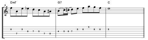3・それではⅡ→Ⅴのフレージングの考え方を身に付けましょう(全て調性はCでいきます。Dm7→G7→Cの進行下でのフレージングです)。大雑把に言ってしまうと、解決すべきコードの構成音に辿り着くための方法です。特に各コードの3度と5度と主音に辿り着けば、非常に強く解決したと言えます。