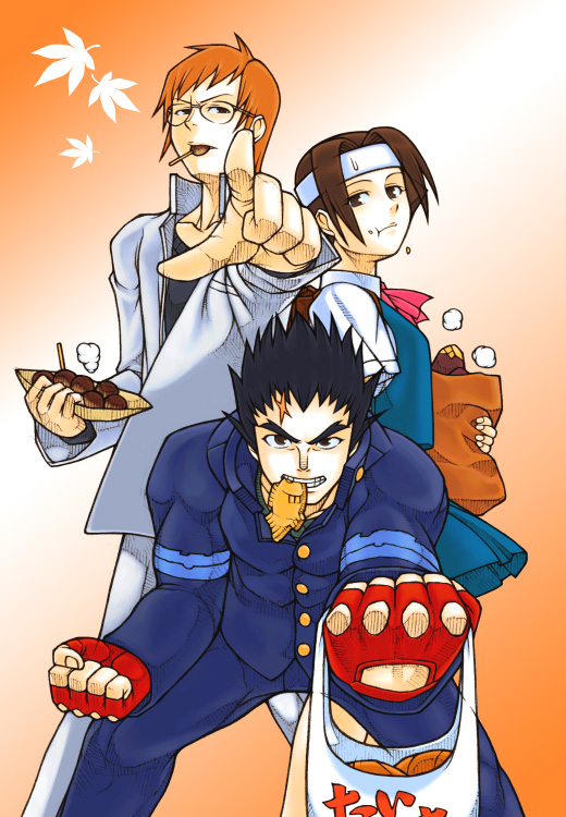 ネットゲームで知り合った方からリクエスト(恭介)をいただいて、描いてみました。 「ジャス学」は続編の「燃えろ」しかしてませんが、デザイナーのえだ■んさんの 絵がどーも好きになれなくて、あまり題材にしてません。 秋ということで「何かを食べてる」をテーマにしましたが、バツに愛着がわかず なぁなぁになってます・・・ 遠近感、つかめてないなぁ。バツちっさ; あと、たこ焼き絵にするの難しい;