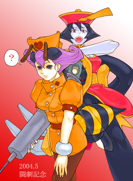 関東の友達が「闘劇」という格闘ゲーム全国大会に参加したのを 記念して描きました。Q-Beeとレイレイはその人たちの使用キャラです。 Q-Beeはうまく描けた試しがないので、やっぱりそんな出来です・・・ 注射器が苦し紛れの金属製です。(レイレイの武器は某宇宙戦艦です) 闘劇自体は諸々の理由で観戦できませんでした・・・○| ̄乙