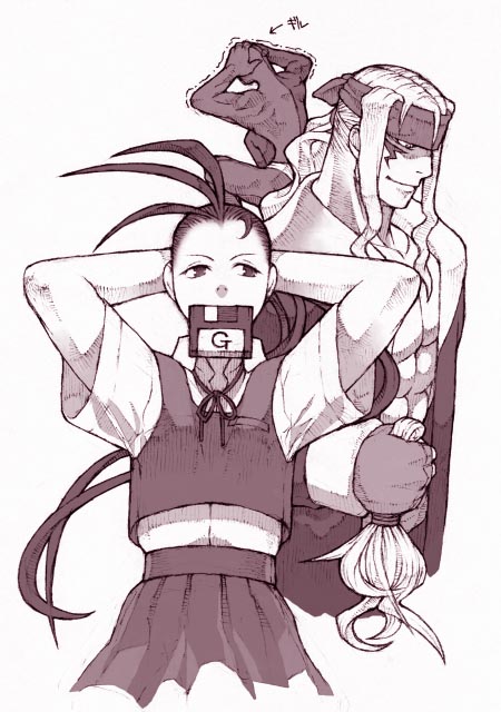 描いた日時が前後するんですが、同人誌順で掲載しました。 「Strike the 3rd」の改訂に伴い、裏表紙用として描いたものです。 アレクにはもちろんパットなんですが、この組合せも結構好きです。 ちなみに後ろにいるのは、文字どおり毛もむしられたギルです。