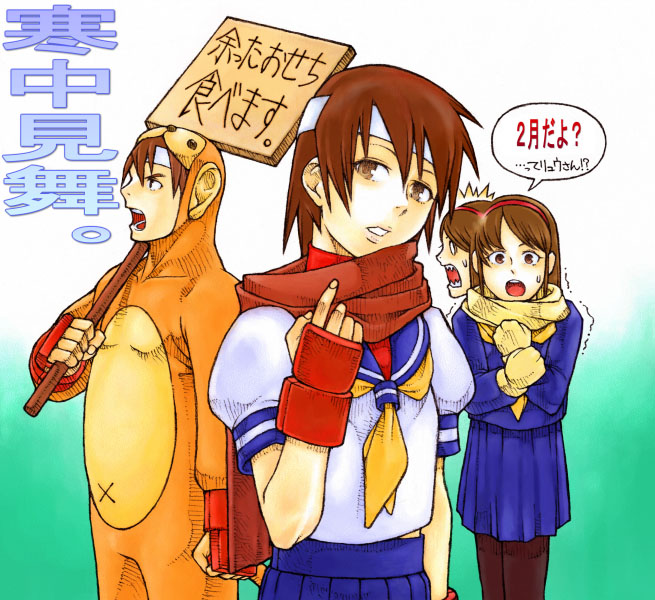 久〜々にカラーを描いてみました。その反動がきっちり絵に出てます。 ストZEROシリーズで使い続けてるリュウに、なんの恨みがあったんでしょうか・・・。 ケイのコメントはさくらに寒くないの?っていう手書きだったんですが 汚い・斜めだったので消しました。 その前に遅すぎた寒中見舞いが情けないです(涙)。