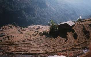 このあたりはモディ川を眼下に見て、対岸は見事な段々田である。山の中腹に復路に通過する村々が一望できる。徳島の祖谷地方のスケールを大きくした感じの風景である。
