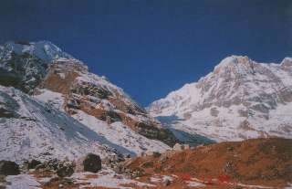 12:40マチャプチャレBCに到着。これまで1枚の写真に写っていた、マチャプチャレが右手、アンナプルナサウスが左手と完全に左右に分かれ、麓まで来たことを実感する。特に、マチャプチャレは、見上げるばかりの高さに見える。 無理をすれば、アンナプルナBCまでいけないことはないが、日数はたっぷりあることなので、ツァンの助言に従って今日はここまでとする。