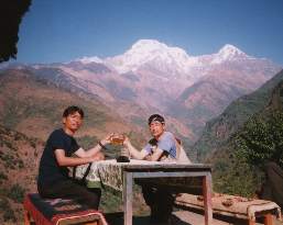 もう、目的を達しての帰り道。再び遠望されるようになった、アンナプルナやマチャプチャレを振り返りながら歩く。昼の食事も、いつものネパール時間。たっぷり2時間である。