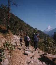 最初は、モディ川右岸に沿ってほぼ平坦な道をいく。行く手にマチャプチャレの鋭角の山頂が見え隠れする。