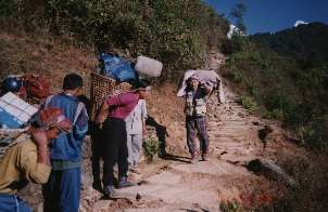 途中、休憩中に他のテント泊トレッカーのポーター達と一緒に休憩。彼らの荷物にりかあさんとノブ氏が挑戦。歩けないことはなさそうだが、頭にかける紐の過重のかけ方に要領がいりそうである。それにしても、彼らのほとんどは草履履き(ビーチサンダル)で、我々より早く歩くのは驚異である。
