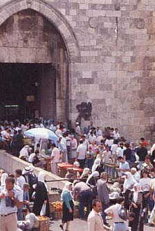 ▲ダマスカス門 12メートルもの高さの城壁をくぐり旧市街の中に一歩入ると、たくさんの露店が出てにぎわっていた。 私が離れてしばらく後、ここで催涙弾が発射されたという。タオルで顔を覆い、痛みに目を真っ赤に腫らした人達が、教えてくれた。
