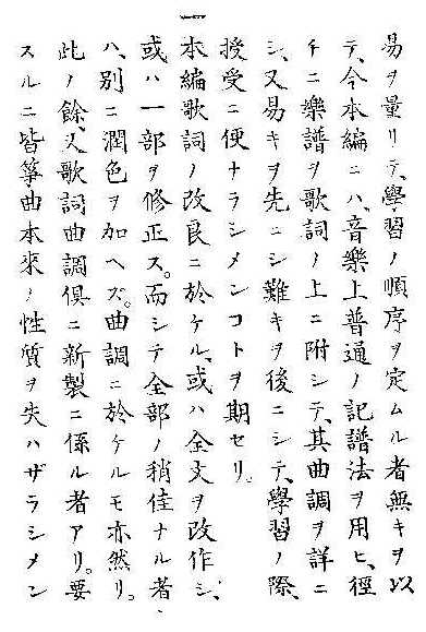 序文は「緒言」の英訳ですが、旧筝曲のなかで佳良な曲を選定し、易しい方から順に配列、楽譜と歌詞を一体化して学習者の便宜をはかった、詞曲は一部を修正したが原曲の良いものは潤色しなかったし古来の筝曲の性質を傷つけないように注意を払ったとあります。歌詞の選定は里見義・加部厳夫が、曲調の査定は山勢松韻・山登萬和ほかが担当しました。「緒言」の末尾には「取調掛長伊澤修二ノ統理考定スル所ナリ」と記されています。