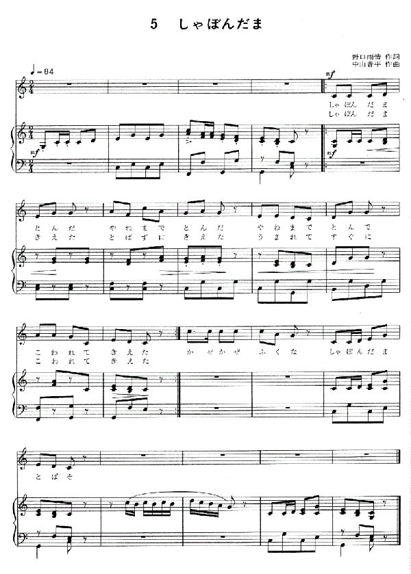 【曲の構成】 歌詞と楽譜を詳しく見ましょう。 ・タイトルは「シャボン玉」です。 ・歌詞には句読点がない。野口存彌 東道人編纂『新資料 野口雨情≪童謡≫』(踏青社)掲載の詩と同じです。 ・二行五連からなる、ひとまとまりの作品です。 ・変ホ長調、四分の二拍子。 ・曲をつける時、一連と二連、三連と四連を対として五連で結び一曲として仕上げました。初めの八小節の繰り返し(AA)と、コーダ(B)の四小節からなっています(AABの旋律形)。それに前奏四小節と後奏四小節が付いています。 <コーダについて> コーダ=曲の終結部。終結を完全にするための部分で、結尾ともいいます。 この曲では、最後にコーダが付けられています。 具体的には、「うまれてすぐに こわれてきえた」でいったん終っていますが、完全に終結させるために「かぜかぜふくな しゃぼんだまとばそ」があります。つまり、歌詞の最後の二行をコーダにし、これで終わりですよと念をおしています。ここが曲の山場なので強く歌います。コーダを付けることにより広がりを持った大きな曲になりました。コーダの威力は絶大です。 【晋平のアイディア】 「かぜかぜ ふくな」の所は、ピアノの伴奏がありません。珍しいことですが、なぜでしょうか。それは歌う人にテンポや表情などの表現を任せるために音を書かなかったのです。さらりと歌ってもよいし、祈るような感情を込めて歌ってもよいのです。晋平ならではのハイカラなアイディアです。 <おや?> 中山晋平 曲『童謠小曲 第三集』掲載の楽譜をよく見ると、「しゃぼんだま とばそ」の「しゃ ぼん」の音符の配列がおかしい。「八分音符 八分音符」になっています。しかも間があいている。これは明らかに誤植です。