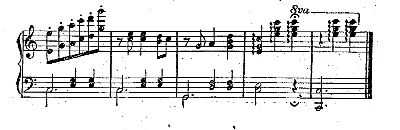 【なぜ『雨降りお月』なのか】 大正十五)年(1926年)四月出版の中山晋平 曲『童謠小曲』第八集(山野楽器店)に収録。『コドモノクニ』に発表した『雨降りお月さん』の楽譜は「だれとゆく」になっていましたが、『童謠小曲』第八集も「だれとゆく」のままです。 しかし、ここで晋平は伴奏譜の前奏と後奏を華やかなものに書きかえました。中間部の伴奏も少しリズムがかえてあります(シンコペーションのリズムにした)。この楽譜で歌ってほしいのです。書きかえた楽譜の曲名は改題され『雨降りお月』になっています。そのため以後の出版楽譜のタイトル名は『雨降りお月』なのです。 この改訂楽譜『雨降りお月』を元にアレンジされレコーディングされたレコードの曲名は『雨降りお月~雲の蔭』です。 ●「レコードの編集時に『さん』が忘れられて(見落とされて)『雨降りお月』になった」と言われているようですが、それは違います。 <レコード情報> 曲名は『雨降りお月~雲の蔭』 ・ビクターレコード番号 50898 昭和四年(1929年)10月発売 歌手は佐藤千夜子。(中山卯郎著『中山晋平作品目録年譜』(豆の樹社)による)。 ・(再録音) 歌手は平井英子 ビクターレコード番号 52878-A(JVE5617-2/録音年月日 1933年7月28日/発売年月日 1933年(昭和八年)11月20日(12月新譜) 【二種類の楽譜】 つまり、二種類の楽譜が存在するのです。一つは『コドモノクニ』に掲載した楽譜で、曲名は『雨降りお月さん』。もう一つは書き直して『童謠小曲』第八集で発表した楽譜で、曲名は『雨降りお月』。これではっきりしたと思いますが、楽譜の曲名が『雨降りお月さん』では、初出の『コドモノクニ』の楽譜をさします。 現在、初出の『雨降りお月さん』の楽譜は出版されていません。出版されているのは晋平が書き直した『雨降りお月』の楽譜の方です。その楽譜にしたがって演奏されるので、曲名は『雨降りお月』です。 【『雨降りお月』楽譜の考察】 もっと詳しく『雨降りお月さん』『雲の蔭』/『雨降りお月』『雲の蔭』の楽譜を見ましょう。 まず、『雲の蔭』の楽譜は、『コドモノクニ』と『童謠小曲』と同じです。「よがあーけーよぅ」の部分も同じ。 ![]() 晋平は、後から作曲した『雲の蔭』の後奏五小節を、たいへん気に入りました(左図参照)。 その五小節は、ピアノ伴奏右手部分に、オクターブのスタカートで弾く上昇進行や、シンコペーションのリズム、アルペッジョが使ってある。そしてフェルマータがある。このフェルマータは晋平会心の作。きっと、気に入っていた。 そこで自分の曲譜集『童謠小曲』第八集に収録の時、『コドモノクニ』に掲載した『雨降りお月さん』の歌い出し前五小節を、この『雲の蔭』の後奏五小節と同じに書きかえ(フェルマータは省略、二ヶ所和音を変更、オクターブ記号の位置も移動)、華やかな曲に仕上げ、曲名を『雨降りお月』にしました。
