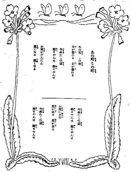 【発表誌】 雑誌『コドモノクニ』(東京社)大正十三年(1924年)一月号に掲載。岡本歸一挿絵。詩のタイトルの下に(曲譜附)と書いてある。詩と曲は同時発表。(大阪府立中央図書館国際児童文学館所蔵、複写可)。 <初出楽譜は「おそらに」> 『コドモノクニ』大正十三年一月号に野口雨情が発表した詩の第五連は、「お空の夕べの」です。しかし、中山晋平が発表した楽譜は、「おそらに ゆふべの」と変えてあります。初出の詩は「お空の」で、初出の楽譜は「おそらに」となっている。 【天才二人の童謡】 <作詞は野口雨情> ・子供が登場しないのに子供を歌った童謡です。女の子でしょうか。男の子でしょうか。・・・雨情は、『証城寺の狸囃子』でも、「狸」という言葉を一言も出さずに成功しています。 ・ 「あの町この町」「今きたこの道」「お家」も、どこの町でしょうか。どこへ行く道でしょうか。お家はどこにあるのか。・・・この頃の雨情は、地方への童謡・民謡の普及運動に情熱を傾けていました。家庭には留まらず、いつも「あの町この町」を旅することの多い生活でした。『あの町この町』は、特定の町ではなく歌う人の思い描く町です。 ・帰ろうとしているはずなのに、家がだんだん遠くなっていくという部分が秀逸です。 <作曲は中山晋平> ・繰り返される「ひがくれる ひがくれる」「かえりゃんせ かえりゃんせ」は、民謡の匂いを生かした、この歌の重要な部分です。日本人は、このような歌が大好き。二回目は少し弱く歌うと、こだまのように余韻を残す響きとなります。 【時代的背景】 関東大震災(大正十二年九月一日)の翌年の発表。歌にも当時の様子が反映されている。雑誌『コドモノクニ』を発行していた(東京社)は、焼跡にバラックを建築した。「自由画の方は社にありましたので、全部焼けてしまひましたから、・・・童謠は全部北原白秋先生のお家にありましたので、幸ひに無事でありましたが、震災後先生はいろいろの御多用のため(註・白秋の小田原の家も被災し、住めなくなっていた)、今回は一回お休みにいたしますから悪しからず・・・」この時の子供たちの自由画や童謡などについては、藤田圭雄・著『日本童謡史Ⅱ』(あかね書房)昭和五十九年発行で知る事ができます。 【挿絵の力】 岡本歸一が描いた挿絵が強烈な印象をあたえます。ヒットには、この一枚の挿絵の力も大きい。日の丸の旗を立てた家々に灯がともり、正月でにぎわう町を羽子板を小脇にはさんだ可愛い女の子が寂しく歩いています。一月号用なのでこのような挿絵になったのでしょう。・・・暮れなずむ町の風景、日本人は、このような絵が大好き。
