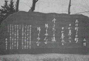 常磐自動車道 中郷サービスエリア(下り線)の雨情詩碑公園にある「あの町この町」の碑の書は、彫刻家・茨城大学名誉教授の山崎猛氏。 【野口雨情の略歴】 <生誕から最初の結婚・離婚まで> ・明治十五年(1882年)五月二十九日、茨城県多賀郡北中郷村大字磯原一〇三番地(現・北茨城市磯原町)に、父量平、母てるの長男として生まれる。本名は英吉。 ・明治三十四年四月、東京専門学校高等予科文学科(早稲田大学の前身)に入学。 ・明治三十七年(満二十二歳)一月に、父が村長在籍中に死亡したため、故郷磯原に帰り、家督を継承するとともに、栃木県塩谷郡喜連川町(現・さくら市)の高塩家の娘ヒロ(明治十五年五月十五日生)と婚約。 ・明治三十八年(二十三歳)ヒロと結婚。 ・明治三十九年(二十四歳)長男雅夫誕生。六月に日露戦争の勝利により樺太の南半分が日本領になったため、七月報知新聞樺太通信員として樺太に赴き、十月に上京する。 ・明治四十年(二十五歳)函館市で新聞記者として二年余流転。妻ヒロも身重な体の上に、生れたばかりの長男雅夫を背負って雨情に付いて行く。函館で焼け出され、札幌に居を移して石川啄木とともに小樽の小樽日報社の創業に加わって三面記事を担当するが、主幹と対立して小樽日報社を去る。 ・明治四十一年(二十六歳)小樽で長女みどり出生するが、八日後に死去。この年、北海道新聞社など道内の新聞社勤務を転々とする。 ・明治四十二年十一月 北海道を離れ、帰郷後上京。 ・明治四十四年(二十九歳)東京有楽社に入社、『グラフィック』の編集に携わる。六月に郷里から妻子を呼び、続いて母てるを引き取る。八月皇太子殿下(後の大正天皇)が北海道に巡啓された際、グラフィックの報道記者として一団に加わり、北海道へ渡る。九月母てる危篤の報に接して帰京したが、臨終に間に合わず。十月郷里に引き揚げ、家業の植林事業に携わる。 ・大正三年(三十二歳)郷里で消防団長、磯原漁業組合長を務め、その後、入山採炭株式会社の事務員となって福島県湯本温泉(現・いわき市)の入山鉱業所へ通う。そのころ芸者置屋の女将・明村まちに世話になる。 ・大正四年(三十三歳)五月十日妻と協議離婚届出。ヒロは磯原の家へ二人の子(雅夫と美晴子)を置いて喜連川に帰る。六月、二児を連れ、福島県富岡町の旅館中屋に滞在して開拓事業に携わったあと、北海道に赴く。 ・大正五年一月 ヒロ除籍。 ・大正六年(三十五歳)十月に「長子雅夫に告ぐ」一巻を手渡して家出、七月、ヒロは喜連川の実家に帰る。事実上の離婚。 <再婚> ・大正七年(三十六歳)十月、明村まちと別れて湯本を去り、単身水戸に出て旅館兼下宿屋「対紅館」の娘で二十歳年下の中里家の長女つる(明治三十五年十二月十二日生)と結婚、水戸市に住んで文学生活を始める。 <ペンネーム> “少年の頃、まぎらわしくない号を付けようと中国の古い本をあさって、春雨の降る意の「雲恨雨情」という詩語からとった。 万葉以後、土を離れてお座敷文学となってしまった日本の文芸を土の上に呼び戻そうと思った”(野口雨情の言葉)。 ・大正九年(三十八歳)『金の船』の童謡欄の選者となる。六月に上京して東京童謡会を結成。ヒロが子供を養育するため磯原の野口家に戻り、雅夫の母として入籍する。「十五夜お月さん」発表。発表当時のタイトルは「十五夜お月」でした。 ・大正十年(三十九歳)「船頭小唄」を中山晋平作曲で発表。「七つの子」発表。十二月、「靑い眼の人形」「赤い靴」を発表。評論『童謡作法問答』や長編童話『愛の歌』を出版。この年、民謡、童謡普及の講演旅行が多くなる。 ・大正十一年(四十歳)「黄金虫」「シャボン玉」などを発表。童謡、民謡の普及を目的として、権藤圓立らと結成した「楽浪園」に加わる。 (註)権藤圓立は、「たなばたさま」の作詞者権藤花代の夫で、歌碑「あの町この町」は権藤圓立の筆になる。 <童心居> ・大正十三年(四十二歳)北多摩郡武蔵野村(現・武蔵野市)吉祥寺に転居。「あの町この町」「兎のダンス」を発表。雨情は巣鴨から移り住んだ際に書斎を建て、応接室、安息室としても利用した。優れた童謡、民謡がここで生まれている。 門に「童心居」と自書し、その脇に「人生は随筆である」と小書して掛けておいた。その心は「一貫した長編でなく、随筆のごとく端的なものであると思う。端的であるから、予めの結果を定めようとしても愚かなことである。そう考えたとき安心もできるのである」。 ・大正十四年(四十三歳)「雨降りお月さん 雲の蔭」「證城寺の狸囃(証城寺の狸囃子)」中山晋平が改作して作曲した歌詞と楽譜が発表された。 ・大正十五年・昭和元年(四十五歳)十一月「野口廣子」の名で両親の野口量平、てる夫妻の墓碑建立。刻字は雨情。 <旅人> 満洲(現・中国東北地方)各地に講演旅行する。「私は旅が好きなのではない。東京におれば苦痛なのである。苦痛を逃れるために、旅の安息所へ出かけるのである。」(野口雨情の言葉)。 ・昭和十八