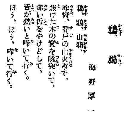 1-2『赤い鳥』大正七年八月號(第一巻第二號)、「鳩」(推稱)、海野厚一。 「いかにも夕方のお寺の森らしくて、蚊のうなりや鳩の啼き聲が聞えるやうです。少々訂正しました。おしまひで、ぽつぽう、ぽつほうと啼かした方がいゝ原作のやうに「お家へかへろ」では餘情がありません。同君の鳩の唄は在來のに即き過ぎてゐて却て劣ります」(北原白秋・評)。