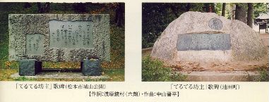 【「お酒を」にしたかった】 長野県北安曇郡池田町八幡神社境内に童謠碑があります(昭和三十八年(1963年)九月二十二日除幕)。鏡村自筆で、「あまい おさけを」となっています。鏡村は、色紙を頼まれると、「おさけを」と書きました。ここは、改作したかったのでしょう。 歌碑に使われている詩は、『てるてるぼうずの館 浅原六朗文学記念館』で見る事ができます。またパンフレットの写真でも見る事ができます。 現在は、「おさけを」と歌われるほうが多くなっています。 与田凖一編『日本童謡集』(岩波文庫)の詩は「お酒を」となっています。