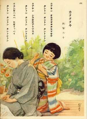 “大正十二年の秋、四歳の短かい生涯を以てわれらの温かき團欒を去つた亡兒慧子(けいこ)は、私が「幼年の友」のために書いたこの謠を殊のほか愛誦してゐた。 さうしてつねに「母さんお肩をたたきませう、タントン、タントン、タントントン」と廻らぬ口で歌つてゐた。 この謠を聞くと、私の前には彼女のひびの切れた赤い頬ぺたと、その戀しい眼とが浮ぶのである。” <西條八十の母トク(徳子)> 右の写真は、年老いた母トクに八十がレコードを聴かせようとしている。母のために蓄音器を買ったのでしょうか。母トクは目が不自由だったようです。メガネをかけている写真も残っています。 西條八十の研究者で、『西條八十』(中公文庫)の著者の筒井清忠氏によると、「西條八十の母親が晩年目が不自由であったことについては、西條八十自身のものをはじめ、記述があったことを憶えていますが、緑内障であったかどうかは判然としない次第です。このことは、拙著には、どこにも記述がございません」(2011年1月24日私信)。 島田磬也『裏町人生』(創林社 1978年)によると次のようです。 “昭和二年頃、八十の家の書生となった後の作詞家島田磬也は、目の不自由な八十の母徳子(トク)の話し相手をよくしたが、徳子は「旅行に行く時には、お母さん行ってきます。帰ってくると必ずお土産を持って母さん只今と挨拶します。本当に親孝行な子ですよ。」と八十のことを語ったという。” 西條八十の息子・八束(やつか)著『父・西條八十の横顔』(風媒社)には次のように書いてあります。 “私が父の母、徳子の死去を知ったのは、一九三四(昭和九)年八月八日、小岩(江戸川区)の三村の家であった。祖母はいわゆる中気で、家で長く臥(ふ)せっており、享年七十四歳であった。父は旅行に出ている事が多かったが、祖母の臨終のときは東京にいて看取る事ができた。 私が知っている祖母は盲目であった。視力を喪失したのは五十四歳頃と言われ、私の顔は知らなかった。その頃よくあった、白髪染めが原因という話を聞いていた。祖母は庭に面した南側の居室で、何時も長火鉢の横にじっと座っていた。当時の事で、ラジオを聴いていた記臆はあまりない。ラジオ放送が始まったのは私が生まれた頃であったが、当時は民放もなく、現在のNHK第一放送だけで、聞いて楽しめる娯楽番組などはきわめて少なかったと思う。” 八十自身は、「白孔雀」二号(一九二二〔大正十一〕年四月)に次のように書き残している。 “私の六十五歳になる母親は眼を疾んで舊臘(きゅうろう・旧臘=年の暮れ)からと或る病院に入つていたが、三月の初旬、やうやく片眼を抉出(けっしゅつ=えぐり出す事)して後、歸宅した。五つの娘には老母が毎夜その義眼を取り出して枕もとに置いてねむるのが非常な驚異であつたらしかつた。”(註)“五つの娘”は、長女・嫩子(ふたばこ) 【「肩たたき」のレコード情報】 以下は、北海道在住のレコードコレクター北島治夫さん所有。 ・昭和三年、歌手 村山久子(ニツポノホン 15312 B面)タイトルは「肩叩き」。 ピアノ 村山道子/ニツポノホン音楽部員。(A面は「ニコニコピンピンの歌」)。 ・@昭和五年、歌手 平井英子(ビクター 51438 B面)タイトルは「肩たゝき」。 日本ビクター管弦楽団。(A面は「キューピーピーちゃん」)。 ・Aビクター B113=再発売(マトリックス番号2002で@と同じ)タイトルは「肩たたき」。 (裏面は「兎のダンス」)。 【挿絵は女の子】 どの挿絵も「女の子」が、お母さんの肩をたたいています。詩を見た画家が、「女の子の母親への優しさ」を感じたからでしょう。