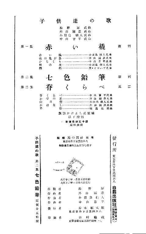 【初出】 『幼年の友』(実業之日本社)大正十二年五月号に中山晋平の楽譜付きで掲載されました。 <「幼年の友」> 明治四十二年一月創刊から昭和初期まで継続して刊行された伝統のある月刊誌。雑誌『赤い鳥』大正七年七月一日創刊よりはやい。表紙や口絵に仕掛けがあったり、誌面のお話をもとに読者に絵をかかせる懸賞が人気を集めたりしていました。 ←『幼年の友』(実業之日本社)大正十二年五月号 詩と曲同時掲載 (註)これは与田凖一編『日本童謡集』(岩波文庫)で見ることができます。 <歌詞>は、句読点がある。「いつぱい」が平仮名。 二行、五連でできています。一、二、五連の一行目は子供の母への語りかけです。三、四連の一行目は情景描写です。 この詩の中で「眞赤な罌粟が笑つてる」が一番優れています。「咲いている」では普通ですが、「笑つてる」としたので名作になりました。 <楽譜>は、二長調(D Dur)、ヨナ抜き長音階。掲載楽譜は五段になっていて、メロディーの変化がわかりやすい。特に「たんとんたんとんたんとんとん」の変化が一目でわかります。「はずみをつけて」の表示はありません。 <挿絵>は、着物を着た女の子が母親の肩をたたいています。母親の髪は丸髷です。時代を反映しています。背景には罌粟の花が描かれています。 【『童謠小曲』に収録】 中山晋平 曲『童謠小曲』(山野楽器店)に収録。 <第五集>「肩たゝき」掲載。「風鈴」「神様のお手」「鳥籠」計四曲。 ・大正十一年(1922年)十月二十日発行。この発行日は第一集のもので、第五集の初版の発行日ではありません。(五版は昭和三年(1928年)一月二十日 大阪府立中央図書館・国際児童文学館所蔵)。 ※『中山晋平作曲目録・年譜』によると「大12.5」。 ▼中山晋平 曲『童謠小曲』奥付 【『中山晋平作曲目録・年譜』の間違い】 この目録には、<第二集>のように、間違いがあります。 <第二集>「てるてる坊主」掲載。「狐のだんぶくろ」「かりがね」「ほたる」計4曲。 ・大正11年(1922年)12月10日発行(二版・1923.12.20大阪府立中央図書館・国際児童文学館所蔵) ・大正11年(1922年)12月20日発行(二版・1923.12.20国立音楽大学図書館所蔵) ・昭和4年(1929)8月10日発行(国立音楽大学図書館所蔵) (註)中山晋平記念館によると「てるてる坊主」の掲載されている「第二集は大正11年12月10日発行。大正12年ではありません」(平成16年3月19日)。 (註)与田凖一編『日本童謡集』(岩波文庫)の「挿絵目次」には、「加藤まさを てるてる坊主」(『中山晋平童謠小曲』(第二集)大11・12より)と書いてある。これは貴重な記録です。 ※中山晋平作曲目録によると「大12.1」。これは間違いです。 「第二集は大正11年12月10日発行が正しい。大阪府立中央図書館・国際児童文学館や国立音楽大学附属図書館で確認できます」