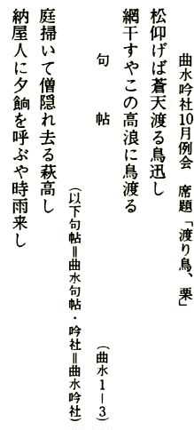 (註T)鮎川哲也著『唱歌のふるさと 花』(音楽之友社)には、「曲水社」と書いてあります。藤田圭雄著『日本童謡史』(あかね書房)では、「曲水吟社」と書いてあります。どちらかが間違い。 静岡市教育委員会が発行した海野厚の研究書『背くらべ 海野厚詩文集』昭和58年2月1日には、句作の頁に「曲水吟社」と記してありました。「曲水吟社」が正しい。 (註U)小田島樹人は、「曲水」の同人で作曲家。厚が短い生涯で心を許しあった人。「おもちゃのマーチ」の作曲者。小田島が厚を友人の中山晋平に紹介した。 <「あの頃のこと」> 『背くらべ』(静岡市教育委員会社会教育課)によると次のようです。 “一九一六(大正五)年、七月初旬、はじめて赤坂丹後町の渡辺水巴(すいは)主宰の句会、「曲水吟社」の例会に出席。三高受験を控えて東京を離れるのが寂しくなり、「高等学校受験のために京都へ立たねばならないことを先生に話した。・・・先生は『京都はいいですね・・・然し、それはなるべく落第なさるように・・・』と続いて先生は笑われたが、この諧謔は、びしりと私には嬉しかった”。 七月中句、再び京都三高を受験する。この時のようすは海野欣也氏(太洋無線常任監査役)によると「兄は三高を受けた時、“英語の試験かと思って入場したら、数学だったので出て来たよ”と言っていた。はじめから気乗りしなかったのだろう」。勿論不合格。九月、再び受験生活に入るべく上京。赤坂区新坂町八二北村方に移り、早稲田の文科に入った。 まもなく父の伊三郎と弟の亮之助も上京し、親子三人で目黒の雅叙園の近くに家を借り、自炊生活を始めた。父にしてみれば東京で事業をおこそうという考え、亮之助も中央大学に通いながら小説の勉強をつづけた。 母親の遊佐は、厚が長男なので東大を出して偉くしたいと思った。当時は法科万能時代で、法科に入って官吏になってもらいたかった。 厚は国元へは法科に入ったということにして実際は早稲田の文科に入った。しかし、講義は面白くなく、楽しめない日々で、結局は浜町の流觴居の水巴の所に足しげく通い、「曲水」の編集を手伝った。 ・『曲水』の編集・発行を手伝っていた頃、すでに早稲田大学大学部文学科英文学科の学生になっていた。 中学、大学で同期だった新間嘉兵衛(静岡市本通り)の談話があります。 「厚一君は、変人だった。中学時代はよく一緒に無銭旅行をし、東海道の旧跡を訪ねた。大学時代は東京の下宿を訪ねたが、昼は寝て夜起き出し、電灯を消してロウソクの火をみつめ、黙って一言も語らずに一夜を明かしたことがよくあった。それで二人は満足した」(「毎日新聞」県版・昭和33年2月24日付)。 俳句のこと、故郷のことを考えていたのでしょうか。