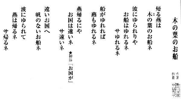 ★北海道在住のレコードコレクター北島治夫さんによると、「戦災で横浜のビクター工場、会社の発売資料など消失してしまったため戦前盤の録音、発売年月日については追跡不可能です。戦後盤ですら、月報などの情報がないものはわかりません」。レコード童謠は、詳細がほとんどわかっていません。 【歌について】 秋が来て燕が木の葉のお船に乗って南の国に帰るというメルヘン。ハ長調、4分の2拍子。リズミカルに弧を描く旋律が、燕の宙返りや波に乗って揺れる木の葉を描写しています。「サゆれるネ」と歌い上げる晋平流の民謡調童謠です。 【「木の葉」の読み方について】 「木の葉」を何と読みますか。 「きのは」でも間違いではありません。でも、「このは」が本来の読み方です。「木」は、一字だけで 読むときは「き」ですが、「木陰・こかげ」「木立・こだち」のように、他の言葉と 合わさって一つになった言葉(複合語)では、「こ」と発音します。「梢」の漢字をあてる「こずえ」も、木の枝の末端、「木末・こずえ」のことでした。 「木の葉」「木の実」など、「の」を付けて、下に続く語を説明する形をとった場合 も、「こ」と言います。木の葉の間からもれてさす日の光を表す「木もれ日」は、 「こもれび」と読みます。古くは「く」とも言ったようです。「果物」は、もともとは「木だ物」の意味です。「だ」は、現代の日本語では「の」にあたります。「木の物」ということです。 ところで、「だ」が「の」の意味で使われている言葉に、もう ひとつ、「けだもの」があります。「毛だ物」、つまり、体中に毛が生えた動物を表 した言葉です。 (読売新聞2010年10月1日掲載 用語委員会・関根健一著『なぜな に日本語』を参考にしました。) 【ツバメについて】 北半球の広い範囲で繁殖する。日本には夏鳥として春先に飛来する。四月末までには本土の多くの地方でその姿を見る事ができる。北海道では、五月に入ってからみられるようになる。 日本で繁殖するツバメの主な越冬地は、台湾、フィリッピン、ボルネオ島北部、マレー半島、ジャワ島など。渡去の時期は、日本海を除く関東以北の地方では九月も半ばで、十月末には日本から姿を消してしまう。(参考文献 百瀬成夫著『日本の動植物季節前線図』(丸の内出版)による)。 インターネットサイトには、飛べなくなったツバメを助けて育てた記録日記が多数出ているのに驚きました。別れのつらさがひしひしと伝わってきます。 【『童謠小曲』(山野樂器)の奥付】 ・中山晋平曲『童謠小曲』、加藤まさを装画。山野楽器店より大正十一年十月から 昭和五年八月にかけて、第1集から第17集まで刊行された。 ![]() <第一集>「砂山」掲載。「七面鳥さん」「げんげ草」「みそっちょ」計4曲。 ・大正十一年(1922年)十月二十日発行の版は国立音楽大学附属図書館所蔵。 ・二版(1923年11月20日発行)は大阪国際児童文学館所蔵。 ※中山晋平作曲目録によると「大11.10」。 <第二集>「てるてる坊主」掲載。「狐のだんぶくろ」「かりがね」「ほたる」計4曲。 ・大正十一年(1922年)十二月十日発行(二版・1923.12.20大阪所蔵) ・昭和四年(1929年)八月十日発行(国立所蔵) (註)中山晋平記念館によると「てるてる坊主」の掲載されている「第二集は大正十一年十二月十日発行。大正十二年ではありません」(平成16年3月19日)。 (註)与田凖一編『日本童謡集』岩波文庫の「挿絵目次」には、「加藤まさを てるてる坊主」(『中山晋平童謠小曲』(第二集)大11・12より)と書いてある。これは貴重な記録です。 ※中山晋平作曲目録によると「大12.1」。これは間違い。 <第三集>「シャボン玉」「黄金むし」掲載。「みぞれ」「舌切雀」計4曲。 ・大正十二年(1923年)一月二十五日発行(大阪所蔵) ※中山晋平作曲目録によると「大12.1」。 <第四集>「けんけん毛虫」「雛祭り」「南京玉」「鈴なし鈴虫」計4曲。 ・大正十二年(1923年)五月二十日発行(2版・1923.12.20国立) ※中山晋平作曲目録によると「大12.2」。 <第五集>「肩たゝき」掲載。「風鈴」「神様のお手」「鳥籠」計4曲。 ・大正十一年(1922年)十月二十日発行。この発行日の記載は第一集のもので、第五集の初版ではない。(5版・1928.1.20大阪所蔵)。 ※中山晋平作曲目録によると「大12.5」。 <第六集>「搖籃ゆらり」「乙鳥の姉さん」「夏の雲」「ピアノは小人」「霰と霙」計5曲。 ・大正十三年(1924年)五月三十日発行(国立所蔵)。 ・大正十一年(1922年)十月二十日発行。この発行日の記載は第一集のもので、第六集の初版ではない。(4版・1926.10.10大阪所蔵) ※中山晋平作曲目録によると「大12.5」。 <第七集>「あの町この町」「兎のダンス」掲載。「チンチン雀」「榧の實」「あがり目さがり目」計5曲。 ・大正十五年(1926年)四月十日発行(池田小百合所蔵) ※中山晋平作曲目録によると「大15.4」。 <第八集>「雨降りお月」「雲の蔭」掲載。「啄木鳥」「おねんね時」「雀踊り」計5曲。 ・大正十五年(1926年)四月十日発行(大阪) ※中山晋平作曲目