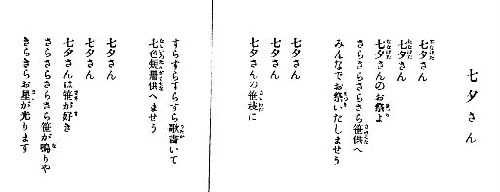【歌詞について】 「のきば」=家のひさしのそば。 「きん ぎん 砂子」=金や銀を砂のような粉にした物です。色紙や短冊などにふきつけて模様を描きます。この歌では、星が空にたくさん輝いているという事です。 「五しきの たんざく」=「五しき(五色)」は、青・赤・黄・白・黒の五つの色。この歌では、いろいろな「たんざく(細長い紙に願い事を書きます)」が、という意味です。 【権藤はなよ 作詞/林柳波 補作詞となっている理由】 横山太郎著『童謡大学 童謡へのお誘い』(自由現代社)には次のように書いてあります。 “この曲は二番まであるが、一番の歌詞は権藤はなよ、二番の歌詞は林柳波と表示されている本が多い。この二人が一節ずつ作詞したと思われているからだ。 このことについて、林柳波のご息女山田小枝子さんから「父は野口雨情とたいへん親しかった。そんな関係で雨情に師事していた権藤はなよから教科書に掲載してほしいと詩を手渡された。父はさっそく編集委員会の会議にかけたがボツになってしまった。しかし林さんが手直しするならばといわれて補作したようだ。どこをどんな風に補作したかは資料が何も残っていないのでわからない。いずれにしろ権藤はなよの詩が下敷きとなって、柳波の手が加えられたことは事実で、だから権藤はなよ作詞、林柳波補作と表示されるのが正しい」とのご指摘をいただいた。 童謡研究家の小松原優氏は権藤はなよの書いた「きらきら お星さま」を柳波が「お星さま きらきら」に直したといっておられると聞いた。あるいはそんなことがあったかも知れない。” (註)林柳波のご息女山田小枝子さん 「どこをどんな風に補作したかは、資料が何も残っていないのでわからない」とは、奇妙な証言です。 著者横山太郎氏の“あるいはそんなことがあったかも知れない。”とは、研究者としてなんとも無責任な発言です。この本の「たなばたさま」は、権藤はなよ 作詞 林柳波 補作 下総皖一 作曲になっている。 【作詩の経緯】 上笙一郎編『日本童謡事典』(東京堂出版)には、次のような事が書いてあります。執筆者は小野由紀。 “作詩の経緯は、はなよが自作を唱歌にしたいと、教科書編集委員である柳波にこれを託し、柳波の修正ののち、今日の形となったという。 はなよには『雪こんこお馬』の中に「七夕さん」という童謡があり、これが柳波修正前の原型であろう”。この本の「たなばたさま」は、権藤はなよ、林柳波作詞・下総皖一 作曲になっている。 この注目すべき記載について調査してみることにしました。 【権藤はな子作「七夕さん」】はなよは、権藤はな子童謠集『雪こんこお馬』(凡人會)昭和七年(1932年)九月一日発行を出している。この中に「七夕さん」という童謡があり、これが小野由紀氏が元になった詩と判断しているものです。国立国会図書館所蔵(2010年7月29日に調査)